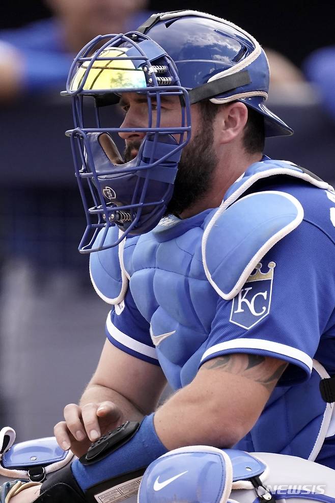 [피오리아=AP/뉴시스] 캔자스시티 로열스의 포수 캠 갤러거가 지난달 29일(현지시간) 미 애리조나주 피오리아에서 열린 미프로야구 메이저리그(MLB) 시범 경기 시애틀 매리너스와의 경기 중 손목에 착용한 '사인' 장치 '피치컴'(PitchCom)을 사용하고 있다. MLB는 포수가 9개의 버튼을 이용해 투수에게 전자적 신호를 보내는 피치컴을 시험 중이라고 밝혔다. 2022.04.04.