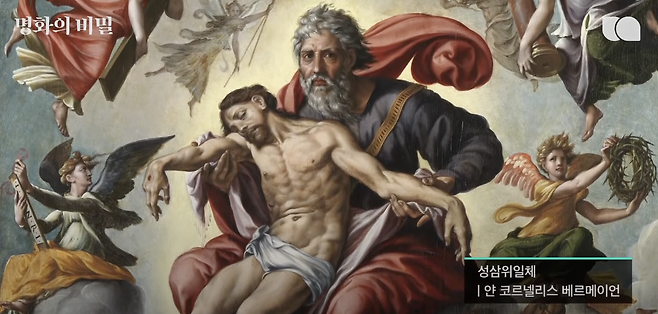 그 뒤로 예수의 팔을 받치고 있는 성부이 세 가지 존재는