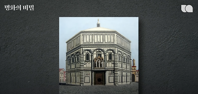 자신이 그린 세례당 그림이 거울에 반사되어 보이게 됩니다.