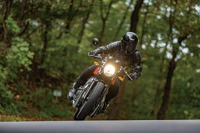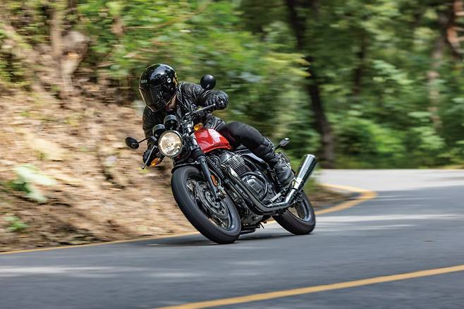 핸들링에 따른 기울어지는 동작이 자연스럽고 무게 중심이 낮게 깔려 있어서 예상보다 적극적인 주행이 가능하다. 클래식한 디자인과 달리 뱅킹 한계가 높고 자잘한 노면 충격을 잘 걸러내어 선회 안정성이 좋다. 제동과 가속에 의한 서스펜션 움직임도 안정적이라서 조금씩 페이스를 높였다.