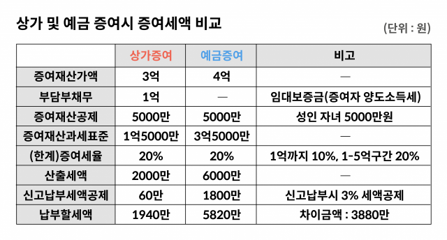 나성실씨가 현재 보유하고 있는 재산은 거주주택인 아파트와 큰 금액은 아니지만 매달 임대료가 꼬박꼬박 들어오는 상가, 그리고 예금 및 보험상품 등을 비롯한 금융상품들로 이루어져 있다. 현재 살고 있는 아파트를 증여하기에는 금액이 너무 커서 증여대상에서 제외하고 현재 4억원에 거래가 예상되는 상가(기준시가 3억원, 보증금 1억원)와 예금 4억원 중 선택하여 증여하려 한다면 어떤 재산을 증여하는 것이 세금 측면에서 더 유리할까?