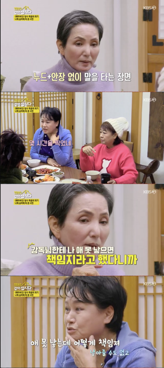 안소영은 “애마부인 찍으면서 세 번 죽을 뻔 했다”라고 말해 모두를 놀라게 만들었다. 안소영은 “누드로 안장 없는 말을 타게 했다. 안장 없이 끈만 잡고 말을 타게 했다. 그 장면 촬영 후 하혈을 했다. 감독님한테 애 못 낳으면 책임지라고 했다”라며 아찔했던 일화를 공개했다.