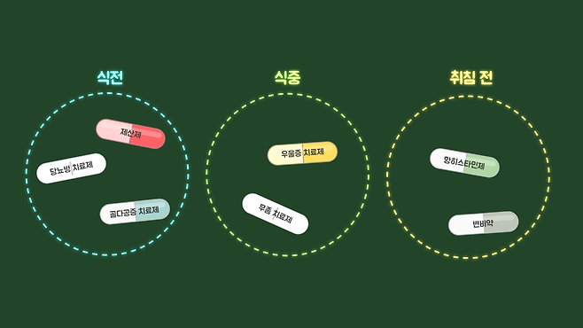 물론 이에 해당하지 않는 약도 많습니다. 식전에 먹는 약(당뇨병 치료제, 제산제, 골다공증 치료제)도 있고, 식중(무좀 치료제, 우울증 치료제) 또는 취침 전(항히스타민제, 변비약)에 먹는 약도 있습니다. 이런 이유로 복약지도가 존재하는 것이고, 잘 따라주면 됩니다.