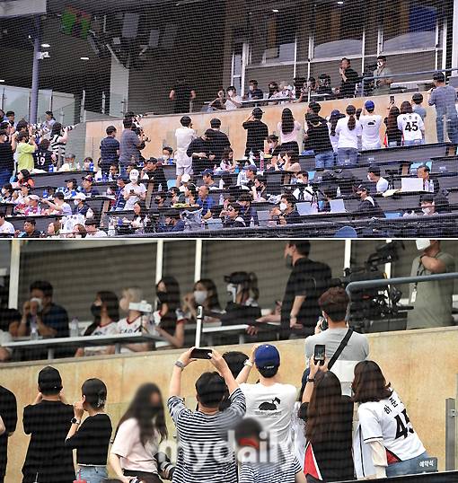 [K-팝 스타들을 촬영하기 위해 야구장을 찾은 팬들에게 불편함을 준 대리찍사들과 일부 기자들. 사진 = 유진형 기자 zolong@mydaily.co.kr]