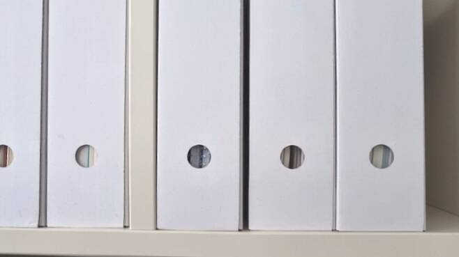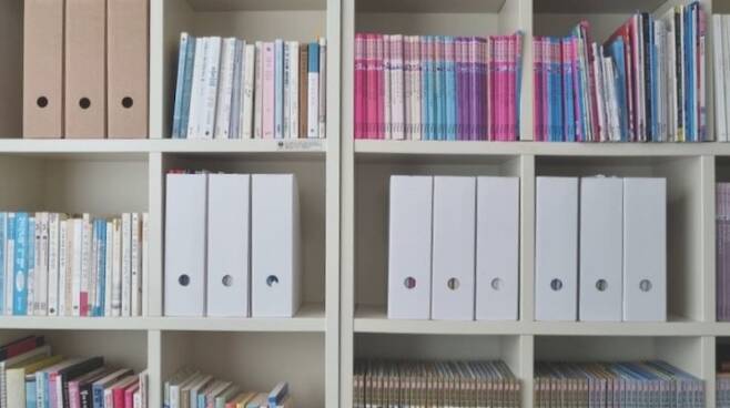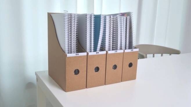저는 이 파일 박스에 표지가 제각각이어서 알록달록 통일감 없는 보관용 서류 파일이나 낱장의 안내문, 프린트 교재 등을 주로 수납해요. 수시로 봐야하는 책이나 파일 등을 꽂아두는 것보다 보관용 파일 등을 수납해 이렇게 돌려놓으면 깔끔해서 좋더라고요.