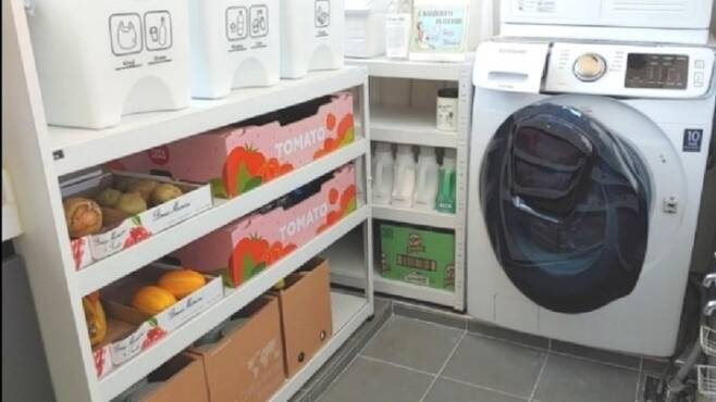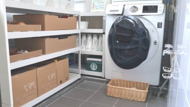 저희 집 세탁실의 모습이에요. 코스트코 토마토 박스를 재활용해 수납해서 반 년 넘게 잘 쓰고 있었는데 몇 달 전 여기도 박스를 뒤집어서 다시 정리했어요! 우드 & 화이트로 깔맞춤 :)