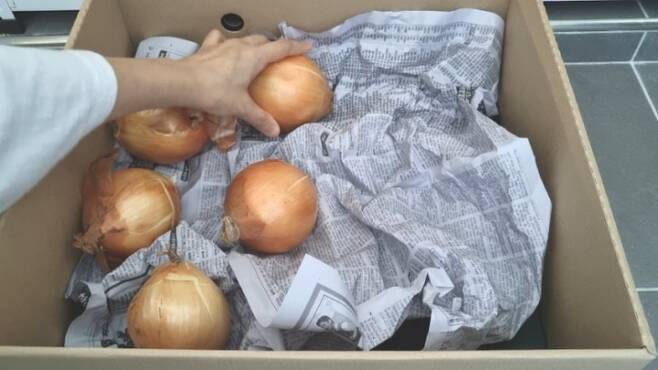 아래칸에는 신문지 깔고 양파를 담아두었더니 튼튼하고 깔끔해서 좋아요.
