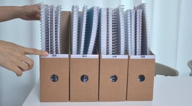 특히 이런 스프링 교재는 튀어나오고, 꽂아도 힘이 없어 정리가 쉽지 않은데🥴 화일 박스에 담아두면 정리도 쉽고 훨씬 깔끔해요.