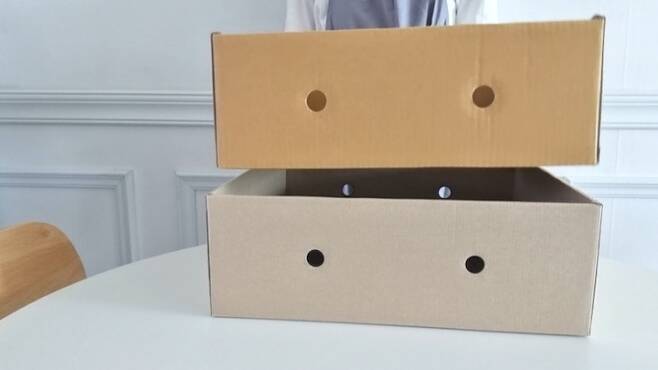 과일상자로 바꿨더니 완전 찰떡~ 높이며 폭이 완전 딱맞게 떨어지고, 구멍이 있어 통기성까지 굿~ 안 버린 나 칭찬해 :)