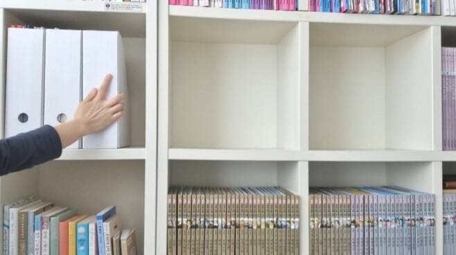 저는 이 파일 박스에 표지가 제각각이어서 알록달록 통일감 없는 보관용 서류 파일이나 낱장의 안내문, 프린트 교재 등을 주로 수납해요. 수시로 봐야하는 책이나 파일 등을 꽂아두는 것보다 보관용 파일 등을 수납해 이렇게 돌려놓으면 깔끔해서 좋더라고요.