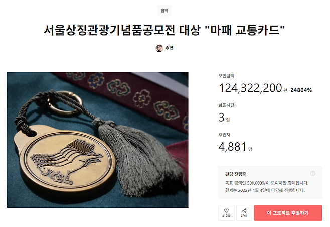마패 교통카드는 모금이 시작된 지 얼마 지나지 않아 생산 가능한 물량이 전부 채워져 조기 마감될 정도로 인기를 모았다. 김 씨는 펀딩이 완료된 뒤 온·오프라인 판매처에서 마패 교통카드를 만날 수 있도록 준비하겠다고 설명했다.