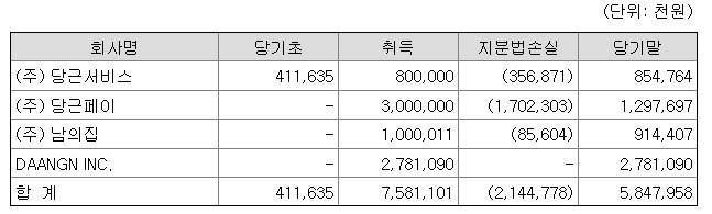 당근서비스는 당근마켓의 자회사로 당근마켓 고객센터를 운영하고 있는데요. 당근서비스는 지난 2020년에도 지분법손실 1억8400만원을 당근마켓에게 안겼습니다. 당근페이는 지난해 3월 설립된 당근마켓의 자회사로, 간편결제 서비스를 지난해 말 론칭했습니다. 남의집은 취향 커뮤니티 서비스인데요. 지난해 당근마켓이 10억원 규모의 투자를 진행하며 지분율 20%를 취득했습니다.