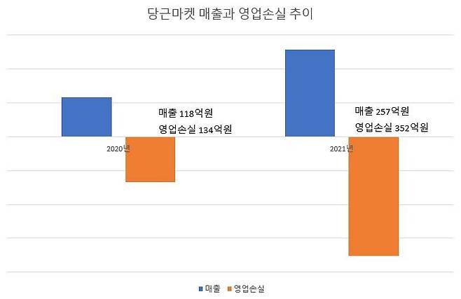 그렇다면 당근마켓의 성적표는 어땠을까요? 매출은 △2020년 118억원 △2021년 257억원을 각각 기록했는데요. 매출이 2배 넘게 증가했죠. 그런데 영업손실도 2배 넘게 늘었습니다. △2020년 134억원 △2021년 352억원을 각각 기록했습니다. 영업비용이 △2020년 251억원 △2021년 609억원 각각 발생했네요.