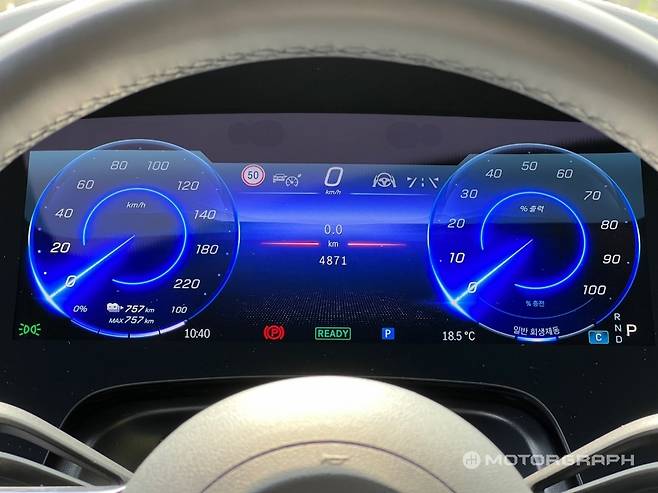 계기판에 나온 주행 거리는 놀라운 수준이다. 약 98%가 남아있는 상태에서 무려 757km나 달릴 수 있다고 표시된다. 환경부 인증 주행거리(478km)보다 약 60%가량 멀리 갈 수 있다는 뜻이다. 이 정도 주행거리면 전국 어디든 갈 수 있겠다는 자신감이 생긴다.