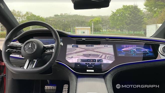 실내는 다시 봐도 전기차 끝판왕이라 부를 만하다. 국내에서는 기본 사양으로 제공되는 MBUX 하이퍼스크린 덕에 미래차 분위기가 물씬 풍기며, 손이 닿는 대부분의 곳이 부드러운 가죽이나 나무, 알루미늄 등 고급 소재로 마감됐다.