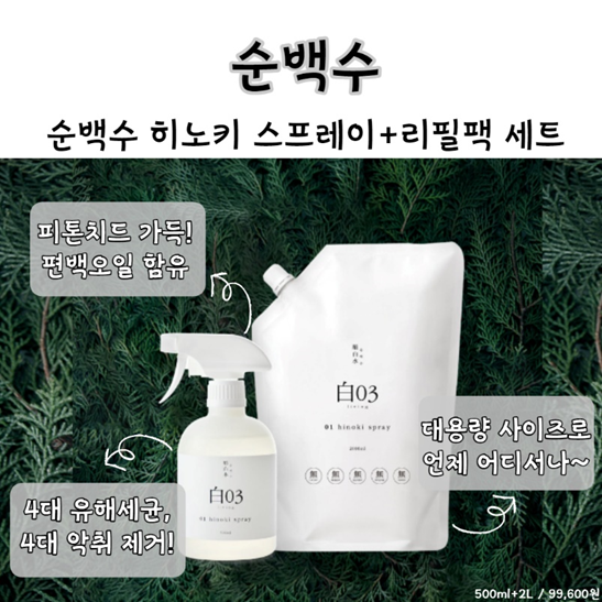 네 번째로는 순백수의 ‘순백수 히노키 스프레이+리필팩 세트’!