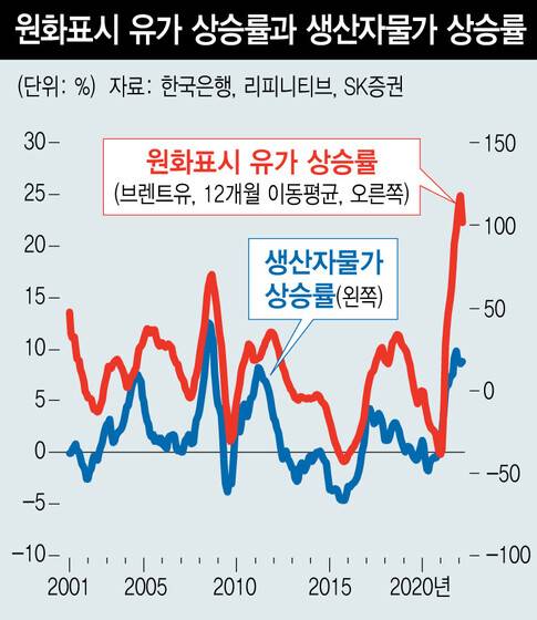 원자재 가격이 고공행진을 하고 있는 와중에 환율 상승으로 수입물가 오름 폭이 더 가팔라질 것이라는 점 역시 부담이다. 비슷한 시기에 우리 물가는 예외 없이 상승 압력을 받았다. 최근 원화로 환산한 유가 상승률은 전년동월비 100% 이상을 기록 중이고 이는 생산자물가에 직접적 영향을 미칠 수밖에 없다. 게다가 이런 식의 물가상승 압력 하에서는 한국은행의 선택 역시 제한될 수밖에 없다. 긴축을 늦추면 환율 측면에서 물가 부담이 커지고, 금리를 빨리 올리면 물가 부담은 소폭 줄겠지만, 높은 가계부채 부담 하에서 차주의 부담이 가중될 것이기 때문이다. 결국 지금은 외국인 투자자들 입장에서도 한국 주식투자가 부담일 수밖에 없다. 국내 증시는 여전히 어려운 상황에 놓여 있다고 판단된다.