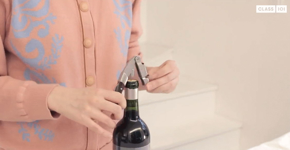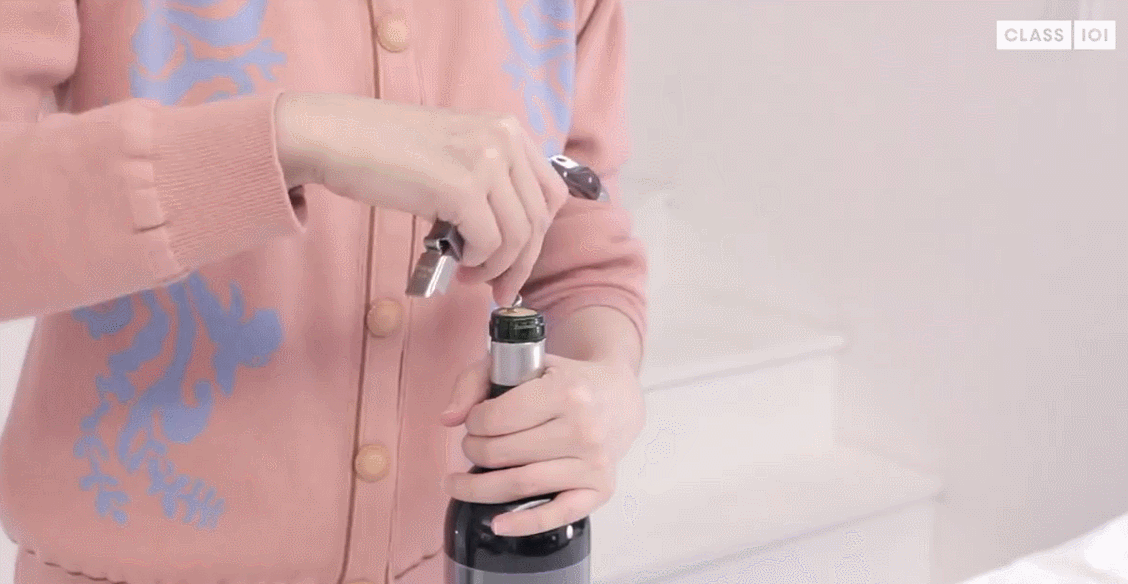 이때 스크류를 끝까지 넣으면 안 돼요. 2-3cm 정도의 여유를 남겨두세요. 이제 두 번의 지렛대를 사용해 코르크를 따 볼 건데요. 지렛대의 중간 부분을 병의 입구에 걸친 다음 힘을 줘서 반대쪽 손잡이를 들어 올려 보세요. 코르크가 밖으로 쑥 나오는 걸 보실 수 있어요.