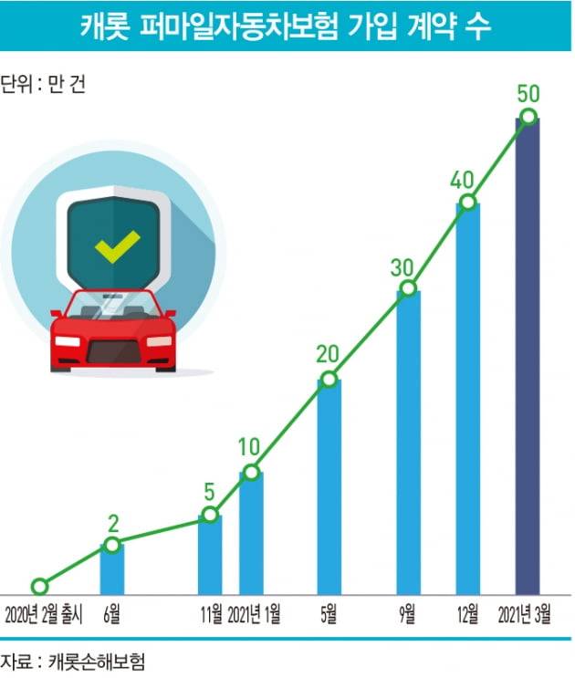 캐롯손보의 주력 상품은 MZ세대(밀레니얼+Z세대)를 겨냥한 ‘퍼마일자동차보험’이다. 한국 최초로 주행 거리와 연계한 보험료를 산정하는 시스템을 도입했다. 2020년 첫선을 보인 이후 출시 11개월 만에 누적 가입 건수 10만 건을 돌파한 뒤 지난해 12월 40만 건, 올해 3월 50만 건을 넘어섰다. 한국에서 가장 빠르게 성장 중인 보험사다. 늘어난 고객 수만큼 자동차보험의 매출도 빠르게 증가하고 있다. 지난해 11월 캐롯손보의 발표에 따르면 2021년 3분기까지 들어온 자동차 보험료는 948억원으로 전년 대비(97억원) 980% 증가한 것으로 나타났다.