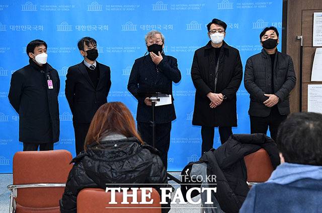 [더팩트ㅣ국회=이덕인 기자] '노무현을 사랑하는 모임'의 배우 명계남이 10일 오전 서울 여의도 국회 소통관에서 이재명 더불어민주당 대선 후보를 지지하는 기자회견을 열고 있다.