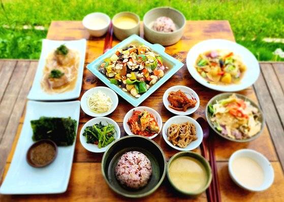 전남 곡성군은 서울에서 자동차로 3시간 30분 거리다. 농업회사법인 ‘미실란’은 곡성 읍내에서 자동차로 5분 거리에 있다. 곡성의 대표 관광명소인 섬진강 기차마을과도 가깝다. 미실란 ‘밥cafe 飯(반)하다’의 대표 메뉴인 ‘발아오색 낭만세트’는 100% 유기농 비건 식단이다(1인 1만5000원, 2인 이상 주문). 고기 반찬은커녕 생선 한 토막 안 올라온다. 흑미로 만든 죽과 누룽지 샐러드, 두부 지짐, 토란을 넣은 궁중 떡볶이 등이 반찬으로 나온다. 여느 고기 밥상보다 풍성하고 맛있다. 보통 이 밥상에 토란표고탕수(2만원)를 추가해 먹는단다. 김탁환은 조만간 평소 산책 나서는 길을 함께 걷는 ‘걷기 학교’를 열 계획이다.