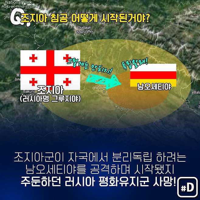 조지아군의 남오세티야 공격 때 남오세티야에 이미 주둔해 있던 러시아 평화유지군 몇 명이 사망했다는 것을 명분으로 러시아가 다음날인 8일 탱크 등을 앞세워 조지아를 공격했습니다.