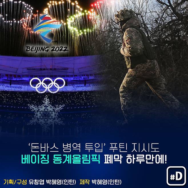 푸틴 대통령이 우크라이나 돈바스 지역의 친러 분리주의자들이 선포한 분리독립을 지난 21일(현지시간) 승인하고서 '평화유지군' 투입을 지시한 것도 2022년 베이징 동계올림픽 폐막 하루만이었습니다.