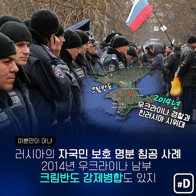 러시아가 인접국 내 러시아인 보호를 침공 이유로 삼은 또다른 사례는 2014년 우크라이나 남부 크림반도 강제병합입니다.