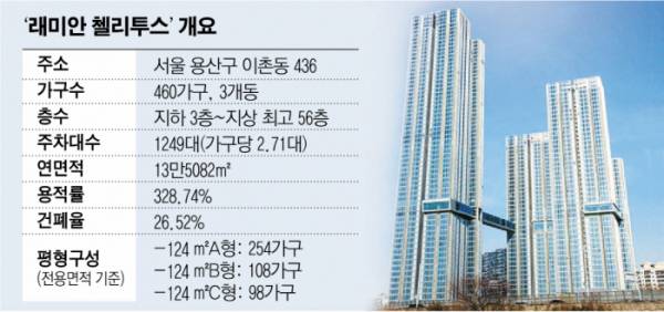 래미안 첼리투스는 2011년 옛 렉스 아파트를 재건축해2015년 완공됐다. 지하 3층~지상 최고 56층, 3개 동, 460가구 규모다. 전 가구가 전용면적 124㎡형의 단일 평형으로 조성됐다. 무엇보다 이 아파트 장점은 바로 높이다. 최고 높이는 약 200m로, 현존하는 한강변 아파트 중에서 가장 높다. 단지명인 라틴어 ‘첼리투스’는 ‘하늘로부터’라는 뜻을 가졌다. 이 아파트를 설명하는 데엔 부족함이 없어 보였다.