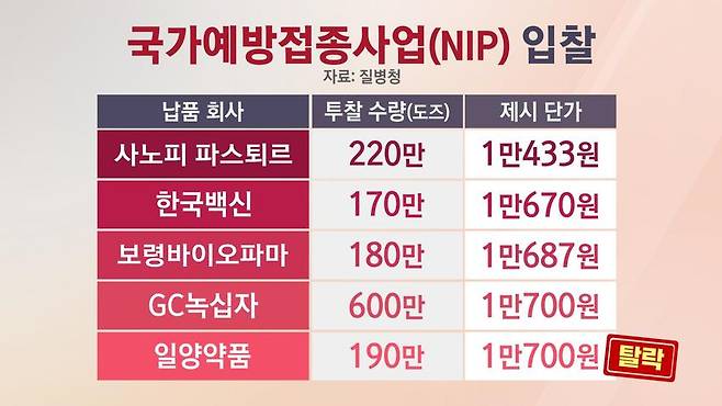 일단 1만400원대로 가장 낮은 가격을 제시한 사노피 파스퇴르가 1순위로 선정됐고, 보령바이오파마와 한국백신이 뒤를 이었습니다. GC녹십자와 일양약품이 같은 가격을 제시했지만, 더 많은 수량을 제시한 GC녹십자에게 납품권이 주어졌습니다.