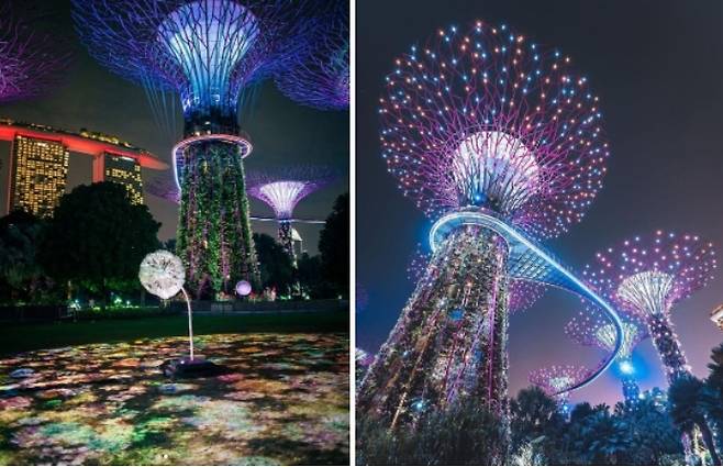 가든스 바이 더 베이는 30만 평 규모다. 베이 센트럴(Bay Central), 베이 이스트(Bay East), 베이 사우스(Bay South)라고 불리는 세 개의 정원으로 이루어져 있다. 특히 높이 약 49m에 이르는 ‘슈퍼트리(Supertree) 숲’이 유명하다. 슈퍼트리는 수직의 거대한 나무 조형물이다. 밤에는 나무에 설치한 조명들이 음악에 맞춰 빛을 내는 트리쇼를 펼친다.