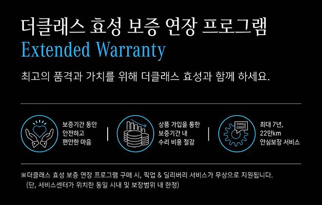 더클래스 효성 보증 연장 프로그램은 차량 등록일로부터 최대 7년, 22만㎞까지 각종 정비와 관련된 보증 수리 혜택을 제공한다.