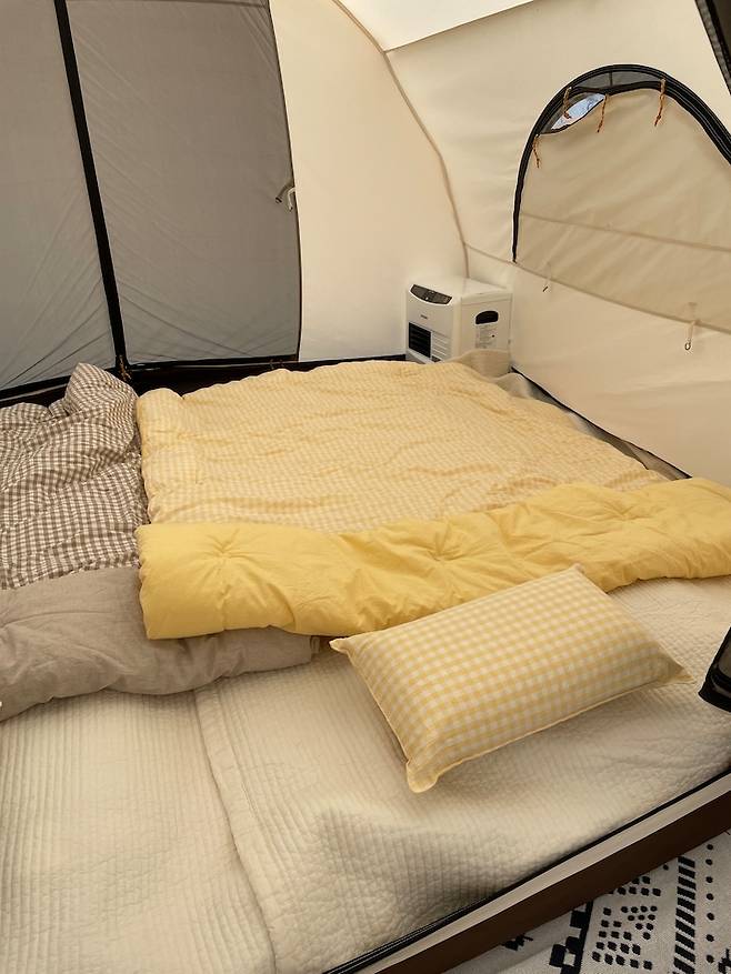 이렇게 자충매트에 매트리스 커버를 씌우면 깔끔하게 정리도 가능하고, 전기장판도 안 밀려서 너무 좋아요~ 비싼 텐트에서 자면 뭐해요!! 잠자리가 불편하면 소용이 없잖아요~