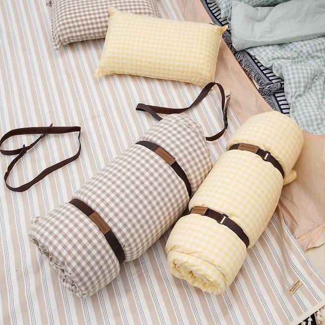 이불을 이렇게 돌돌 말아서 끈으로 감아서 들고 다니면 된답니다! 잠자리는 무조건 편해야 하니까 많이 알아보시고 오래 사용할 수 있는 제품들로 골라보세요! 자는 게 불편하면 정말 힘든 캠핑이 될 거예요... ㅠㅠ