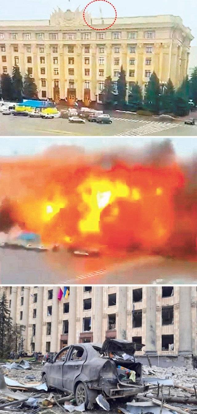 러 미사일, 우크라 하리코프 주정부 청사 폭격 1일(현지 시간) 오전 8시 1분 52초 우크라이나 제2도시 하리코프 중심 주정부 청사와 ‘자유의 광장’에 러시아군 미사일(점선 안)이 떨어지고 있다(위쪽 사진). 미사일이 적중한 청사와 옆 건물에서 화염과 검은 연기가 솟아오르고 있다(가운데 사진). 화염이 가라앉은 뒤 자유의 광장에 새까맣게 타버린 차량이 덩그러니 놓여 있다. 우크라이나 내무부는 이 공격으로 적어도 10명이 숨지고 35명이 다쳤다고 밝혔다. 하리코프 시장은 “하리코프는 포위됐다”고 밝혔다. 트위터 화면 캡처·하리코프=AP 뉴시스