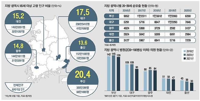 지방 5대 광역시(부산·대구·광주·대전·울산)가 고령화 덫에 걸리고 청년 유출이라는 깊은 늪에 빠졌다.