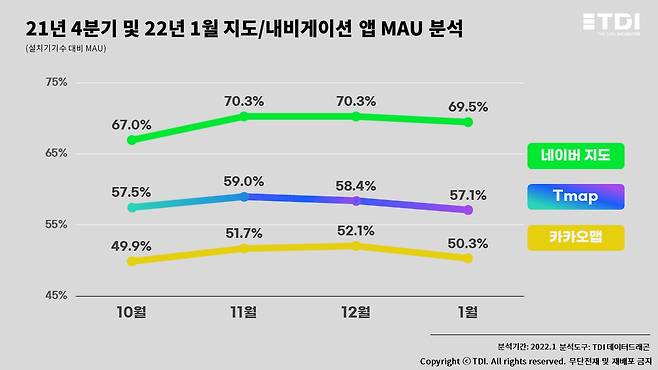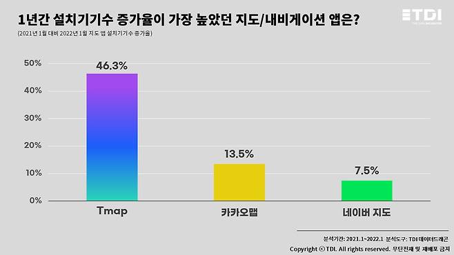 Tmap은 내비게이션 기능이 중심이 되는 앱으로, 앞서 살펴본 두 앱처럼 대중교통과 관련된 정보는 제공하지 않는다. 그러나 주행 습관 관리, 드라이브스루 픽업, 주차장 찾기 등 운전자들이 편리하게 이용할 수 있는 기능이 두루 갖춰져 있으며, 일정 주행거리와 주행 습관 점수를 만족하면 자동차 보험 할인 혜택을 제공해 자동차 운전자들에게 가장 인기가 많다. Tmap 앱은 최근 대리운전, 킥보드, 전기차 충전, 주차 등의 기능을 앱에 추가해 설치자가 큰 폭으로 늘어났으며, 이를 통해 토탈 모빌리티 플랫폼으로 도약할 준비를 하고 있다.