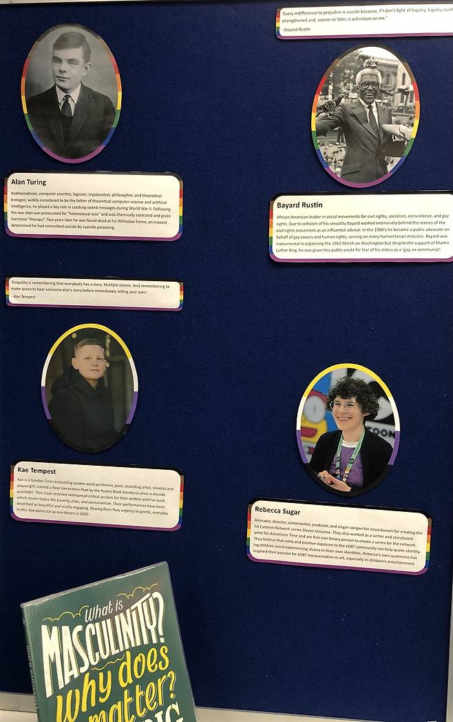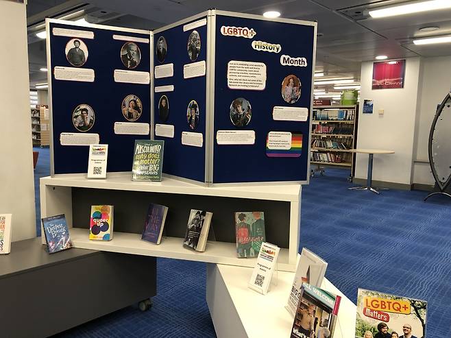 | ▲ 영국 케임브리지 공공 도서관은 논쟁의 한복판에 있는 미국 학교 도서관과는 대조적이다. 들어가면 LGBT 역사의 달을 기념하는 테이블이 있다. 관련 서적이 죽 전시되어 있고 알아두면 좋을 인물들의 사진과 짧은 설명이 있다. |