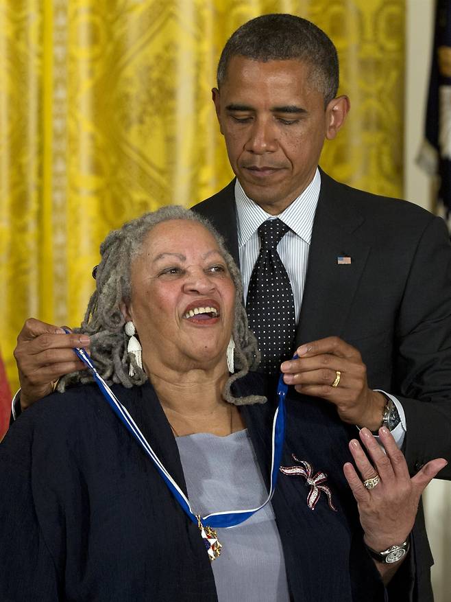 | ▲ 버락 오바마 대통령이 워싱턴 백악관 이스트룸에서 열린 시상식에서 작가 토니 모리슨에게 자유의 메달을 수여하고 있다. 2012.5.29 |