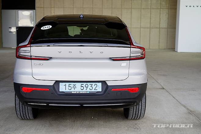 후면부는 C40 리차지만의 디자인으로 완만하게 내려오는 쿠페형 루프라인과 면을 강조한 와이드한 디자인을 통해 고성능 이미지가 강조했다. 리어램프는 도어락 해제시 세레모니 기능을 갖췄다. 2개의 리어 스포일러는 고속주행시 최대 4%의 다운포스를 증가시킨다.