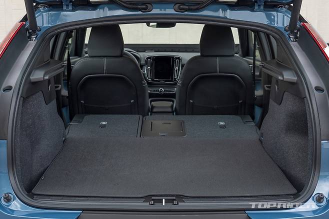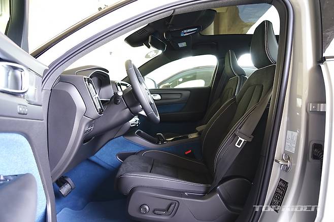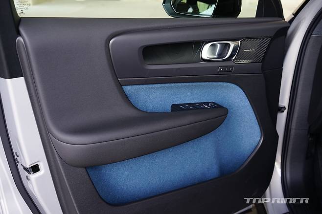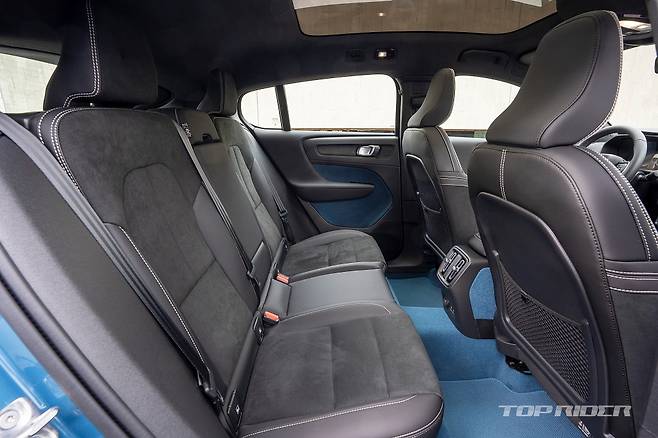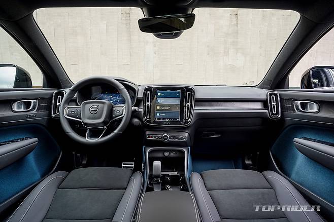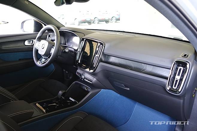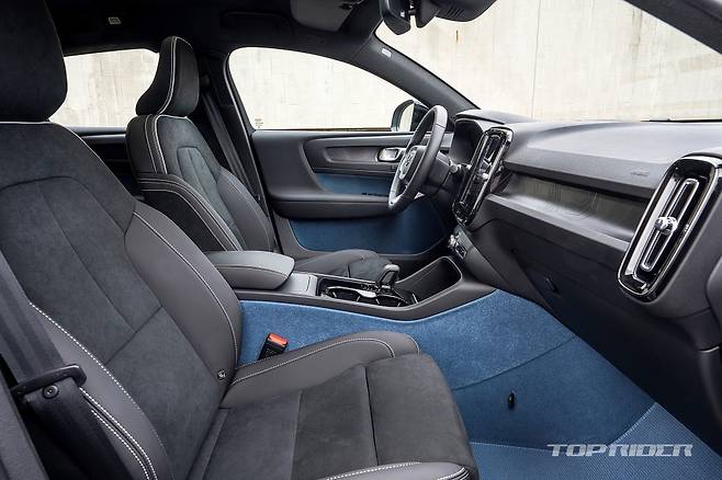 실내의 기본적인 구성은 XC40과 다르지 않다. 다만 XC40의 오렌지 컬러 직물 마감재는 피요르드 블루로 변경되고, 시트는 100% 레더 프리로 가죽이 전혀 사용되지 않았다. 루프의 대부분 면적은 유리로 마감돼 개방감이 좋다. 자외선 차단 코팅으로 햇빛의 열감은 적다.