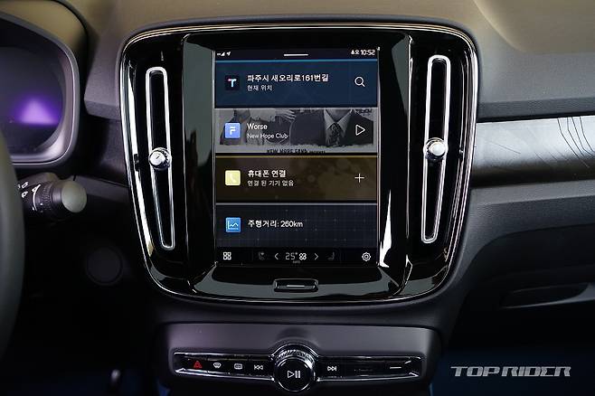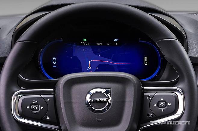 시동 버튼이 삭제돼 키를 지니고 탑승한 상태에서 D 레인지로 변속하면 출발이 가능하다. 엔진 가동이 없는 전기차에서는 엔진 START 개념이 전자기기의 READY나 STANDBY로 달라져 어찌보면 당연한 변화다. 그 외 대부분의 기기 조작은 기존 XC40과 큰 차이가 없다.