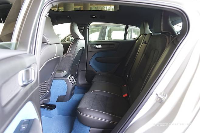 C40 리차지의 1열 시트포지션은 XC40 내연기관 모델과 크게 다르지 않은데, 아주 낮은 포지션까지 지원해 상반신이 긴 성인에게도 여유롭다. 여느 전기차가 센터터널을 낮추거나 없애는 것과 달리 C40에서는 시트 바닥의 배터리를 센터터널로 이동시킨 설계가 이유다.