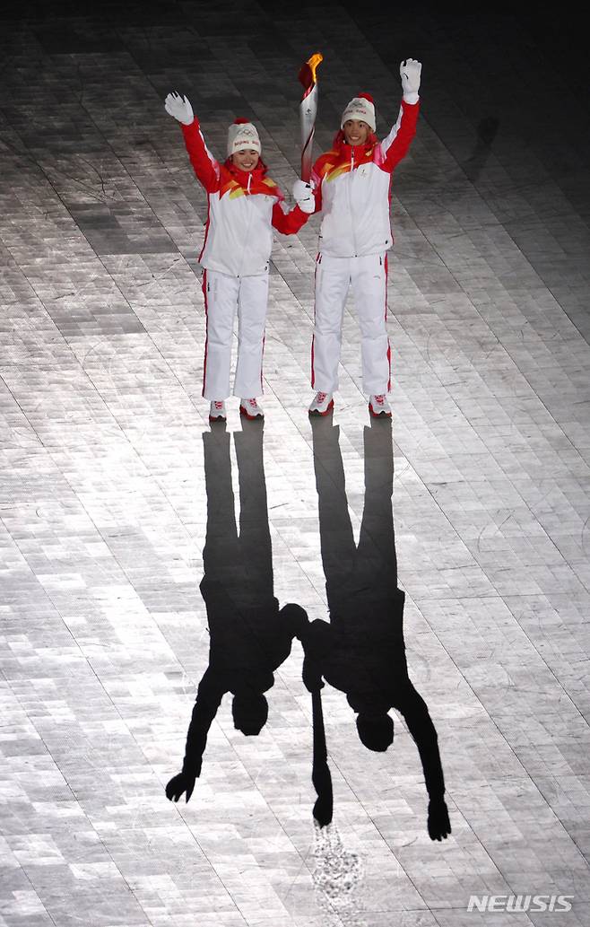 [베이징(중국)=뉴시스] 홍효식 기자 = 4일 오후 중국 베이징국립경기장에서 열린 2022 베이징 동계올림픽 개막식에서 최종 성화 주자인 디니걸 이라무장과 자오자원이 성화대로 향하고 있다. 2022.02.04. yesphoto@newsis.com