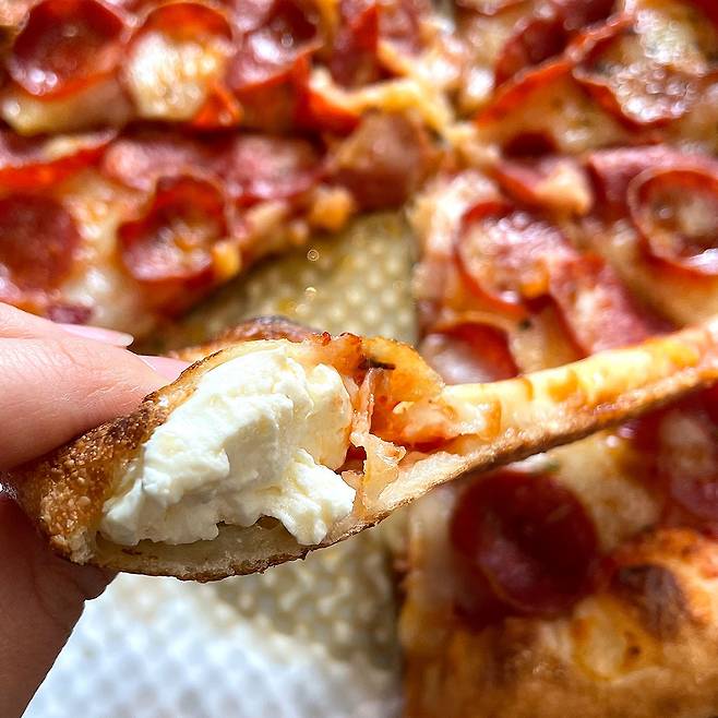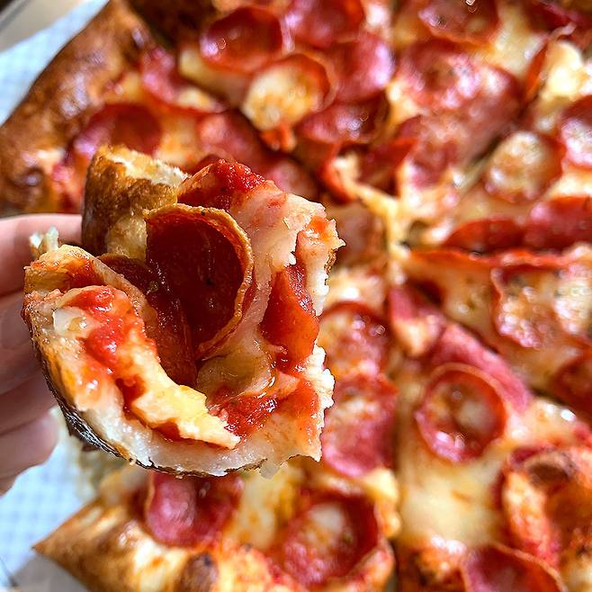 국내 다른 해외 브랜드의 같은 사이즈 페퍼로니 피자보다 토핑이 약 30% 더 많다고 강조하던데, 30% 까지나 많은 건가..? 싶었어요ㅋㅋㅋ 그런데 한 입 물자마자 말도 안 되는 겉바속촉 페퍼로니 식감에 놀라고 도우와 치즈 토핑 사이에 듬뿍 들어가 있는 토마토소스에 놀랐답니다..! ㅇ0ㅇ