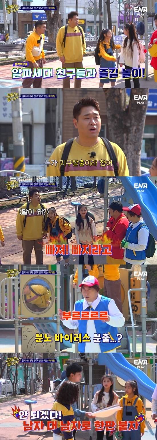 3일 방송된 ENA PLAY채널과 디스커버리 채널 코리아 '고생 끝에 밥이 온다(이하 고끝밥)'에서는 82 개띠즈가 요즘 초딩 알파세대들과 놀이터에서 격돌하는 모습이 그려졌다.