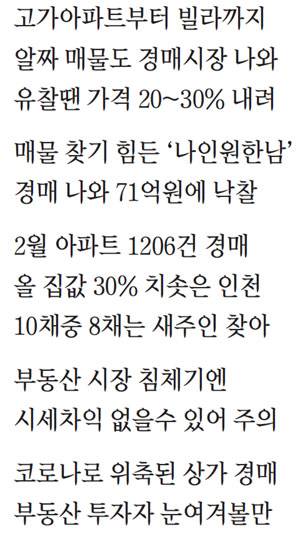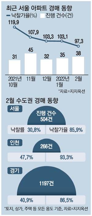 경매업계에서는 지난해와 달리 서울 아파트 경매 물건이 유찰되는 경우가 많다는 점에 주목하고 있다. 서울 아파트 경매 물건은 한 차례 유찰되면 감정가보다 20% 깎인 금액으로 최저입찰가가 다시 설정된다. 수도권은 30% 하락한 금액으로 최저입찰가가 책정된다.