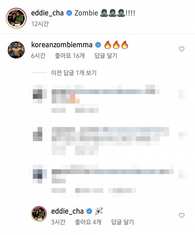 에디 차 코치는 정찬성과 찍은 사진과 함께 "좀비(Zombie)"라는 짧은 글을 게시했고, 뒤에 좀비 이모티콘 3개를 붙였다.