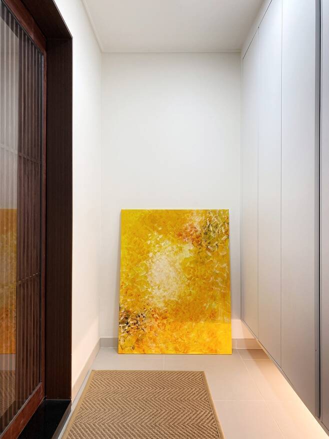 현관을 들어서면 노란 그림 한 점이 저희 가족을 먼저 맞이해줘요. 노란색 그림을 집에 두면 복이 들어온다는 설이 있어서 미술을 전공하신 저희 어머니께 제가 하나 그려주시라 부탁드려 얻어낸(?) 작품입니다. 어머니께서 그려주신 그림이라 그런지 더욱이 저희 집에 좋은 기운만 가득할 것 같은 기분이 들어요 :)