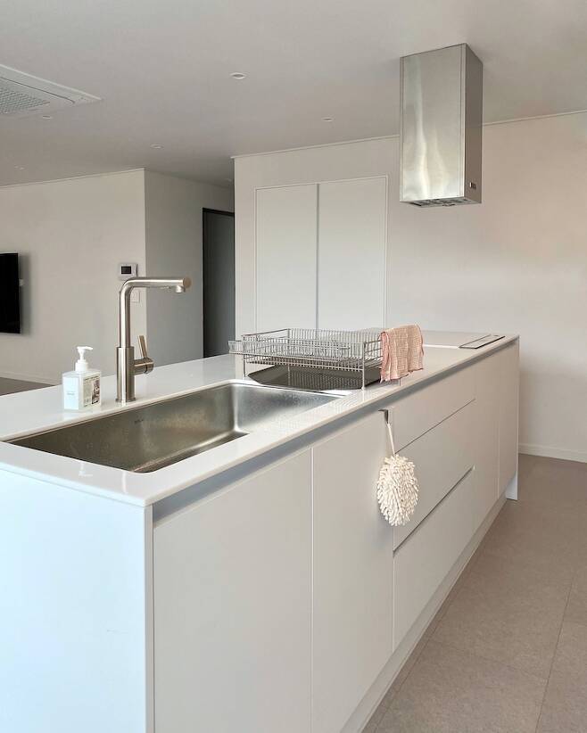 평소 음식을 먹는 것도, 요리를 하는 것도 좋아하는 터라 주방에 있는 시간이 긴 만큼 아이들이 뛰어노는 모습도 바라볼 수 있도록 싱크와 인덕션을 아일랜드 쪽에 배치했어요. 항상 아이와 눈을 맞추고 아이가 하는 행동을 주시하며 거실과 주방에서 함께할 때 늘 아이를 바라보고 있을 수 있도록 가벽, 파티션 등 모든 장애 요소를 없애고 시원하게 틔워 공사를 진행했어요 :)